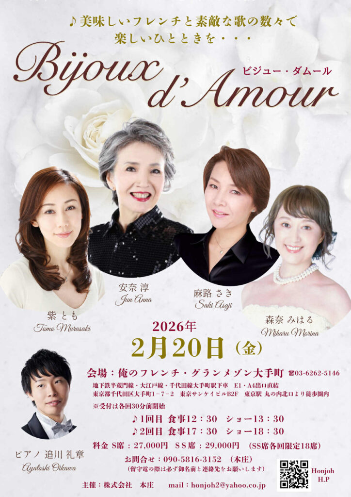 令和8年2月20日(金) 素敵なフレンチで豪華なゲストの歌とフレンチのひと時を開催します。